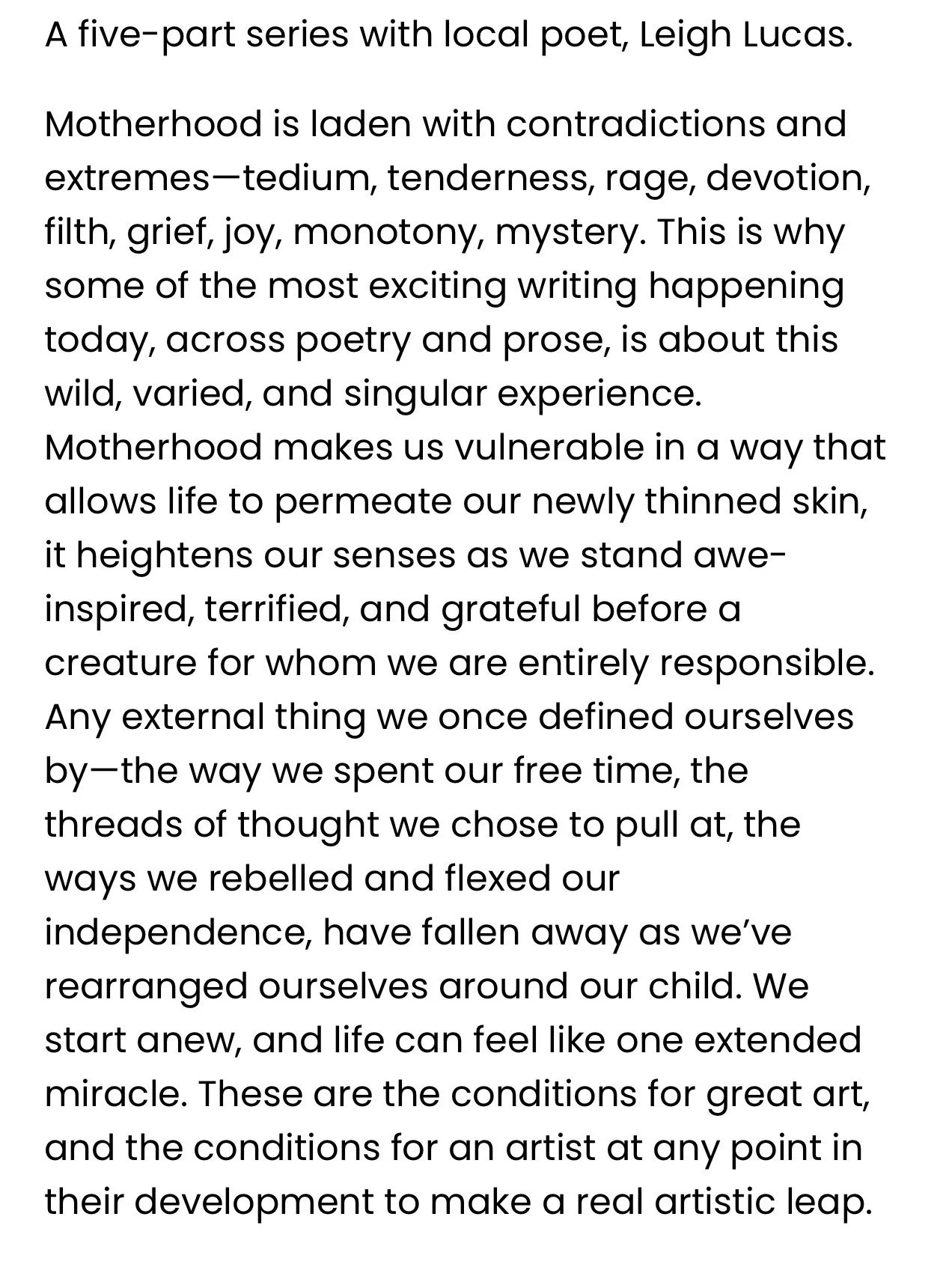 “Wonderful, wonderful concept for the course and in its execution, too. Leigh created a community out of thin air. We're still meeting despite her maternity leave.”